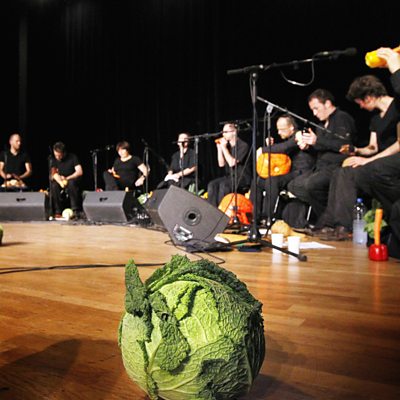 Meet the band that makes detailed music from vegetables and hear them play 'Brazil' - their tribute to the film of the same name by Terry Gilliam. (Image: An orchestra with vegetables on stage. Credit: Patrick Bernard/ Getty Images)