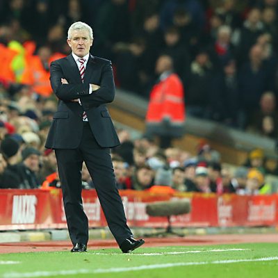 Stoke manager Mark Hughes reacts to the 2-0 win over Watford.