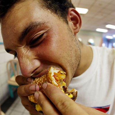 Corn is everywhere, even inside us. Most things we touch and eat all contain corn or its derivatives, as the crop has found its way in to most of our food supply, from animal feed to burger patties. By testing strands of people's hair, Dr Stephen Macko can see how much of us is made up of corn - in some cases, it's as high as 90%. (Image: A man eating a burger. Credit: Joe Raedle /Getty Images)
