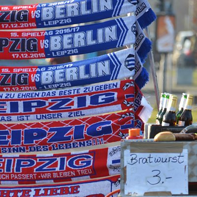 RB Leipzig, a German football team, has been hugely successful in its short eight-year existence. But it is widely derided in much of Germany as the creature of a multinational company more interested in selling cans of energy drink than winning football matches. At the halfway point of the season RB Leipzig is second in the Bundesliga, behind only the perennial champions Bayern Munich, having started life at the fifth level of German football playing in front of 2,000 spectators. RB stands for RasenBallsport, which translates roughly as “lawnball”. But everyone knows that RB really stands for Red Bull, which bought the team in 2009. In one protest this season fans in Dresden threw the severed head of a bull onto the pitch. Tim Mansel reports for Assignment on the rise of RB Leipzig and what it tells us about the continuing east/west divisions within Germany. (Photo: RB Leipzig football scarves on sale at outside the club's stadium. Credit:Tim Mansel)