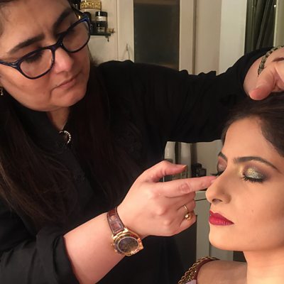 Shamain Faruque is one of the most well known bridal make-up artists in Pakistan. Shamain’s salon is filled with nervous brides waiting their turn. Some sleep on sofas with their full bridal hair in place as families concern themselves with every conceivable detail. Weddings are big business in Pakistan and for Shamain her faith plays a big role in her artistic direction. As she works prayers are pumped through her Karachi based salon, as she channels beauty through God. Lucy Wearing, pop star Ellie Goulding’s make-up artist, profiles Shamain, her work and the role religion plays in her busy life. Lucy met Shamain whilst teaching a make-up course in Dubai. They have remained friends ever since which is remarkable as they are the polar opposites - Lucy is agnostic whilst Shamain prays three times a day. Watching Shamain at work is fascinating; she works like an artist with a canvas. Her brides remain silent while she goes through the ‘look’. How does religion inspire her artistic vision? (Photo: Shamain Faruque makes-up a client)