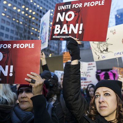 President Trump has defended his travel ban on people from seven Muslim-majority nations. We speak to some of those affected by the ruling. Murtadha al-Tameemi is an Iraqi software engineer for Facebook in Seattle, who is now unable to leave the US, and Samira Asgari is an Iranian genetics scientist with a research job at Harvard Medical School, who was blocked from boarding a flight from Frankfurt to America. Also in the programme, Volkswagen has overtaken Toyota as the world's biggest car-maker, despite an emissions scandal that has damaged its reputation. We find out more from Professor David Bailey, a motor industry expert at Aston Business School. The BBC's Alex Ritson reports on the difficulties of doing business in areas taken over by militant groups such as so-called Islamic State. Plus Lucy Kellaway of the Financial Times is back, announcing the winners of her annual business jargon awards for 2016. (Picture: People protesting the immigration executive order. Picture credit: Getty Images.)