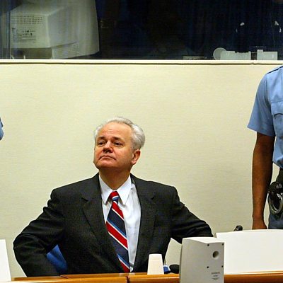 In February 2002 the former Serbian president, Slobodan Milosevic, went on trial for war crimes committed in Croatia, Bosnia and Kosovo. The man once known as the 'butcher of the Balkans' would die in prison before the trial had concluded. Louise Hidalgo has been speaking to two lawyers, Zdenko Tomanovic and Steven Kay QC, who worked on his defence. Photo: Slobodan Milosevic in the courtroom at the International Criminal Tribunal for the former Yugoslavia in The Hague, The Netherlands, February 2002. (PAUL VREEKER/AFP/Getty Images)