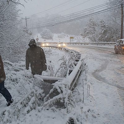 Sam Schneski recorded this as he ferried a tank of maple sap on the back of a truck. (Picture: Two men (not contributor) walk down an icy road in Vermont, 29/102011 Credit: DON EMMERT/AFP/Getty Images)