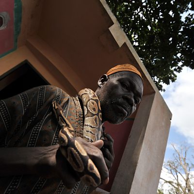 Correspondent Ed Davey and Ghanaian biochemist Jafar Habib visit the Temple of the Python, in Ouidah, Benin, a pilgrimage for many Voodoo believers. Benin is one of only two countries in the world to formally recognise Voodoo as a religion – more than half of Beninese are believers. Voodoo means ‘god’ or ‘power’, and followers believe a natural force flows through everything.