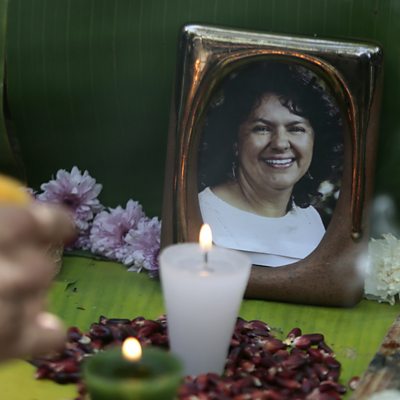 It's been a year since the murder of Berta Caceres, the environmental campaigner from Honduras. Her daughter, also called Berta but known as Bertita, tells Jo Fidgen what it was like growing up fearing that her mother could be killed any day. David Elliott is an Australian cattle farmer turned dinosaur hunter. He's found hundreds of bones in Queensland and has now set up a museum. Lydia Burton reports for Outlook. Goran Bregovic is one of the biggest names in Balkan music. He's sold more than 15 million albums worldwide and leads a 40-strong, energetic brass-band playing a blend of Gypsy music, traditional Balkan rhythms and rock, inspired by his hometown Sarajevo. Image: Candles and flowers in front of a photograph of Honduran activist Berta Caceres Credit: PEDRO PARDO/AFP/Getty Images