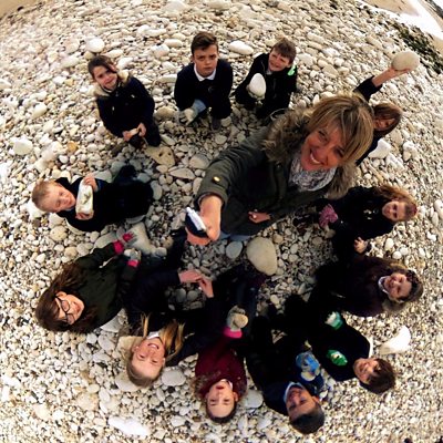 School children help gather white pebbles which will feature at the prestigious show.