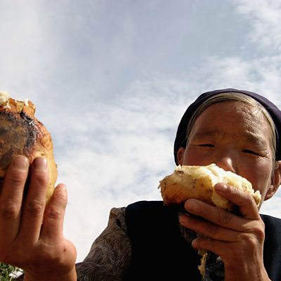 In our second and final episode on the humble spud, we meet the people who see the global economic future as being potato powered. The potato is the world's most produced staple food after rice, wheat and corn - yet historically, it was seen as the root of filth, misery and obesity. In our previous episode we heard how over time it came to be used as a tool of power by the state, to create a healthy and robust workforce. This week, food historian Rebecca Earle, tells us that history is repeating itself in China, which is now the world's biggest producer of potatoes. China's central government sees the potato as key to food security, but it's got some work to do to produce a cultural shift away from rice. We'll be serenaded by one of the country's potato champions, the operatic 'new farmer' Sister Potato, who says she is changing hearts, minds and cuisine with her songs. Then we'll head to the streets of Beijing to gauge enthusiasm and ask can the spud shake off its lowly reputation? Africa and developing countries have the biggest predicted growth in potato production in the coming decades. But is the world in danger of putting all its spuds in one basket? We’re asking whether the potato is the answer to food security or if the vegetable’s patchy history doomed to repeat itself. Plus we head to Peru to visit the scientists protecting thousands of varieties of potato, and meet the man who ate nothing but potatoes - for a year. (Image: A farmer eats a potato in China . Credit: Spencer Platt/ Getty Images)