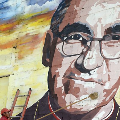 On March 24 1980, as El Salvador edged towards civil war, a right-wing death squad shot dead the head of the Roman Catholic church. Archbishop Oscar Romero was killed by a single bullet as he said mass at the altar in San Salvador. Mike Lanchin hears from local journalist, Milagro Granados, who was there at the moment of the assassination. (Photo: A man cleans a mural of former Archbishop Romero in Panchimalco, El Salvador. Credit: Marvin RECINOS/AFP/Getty Images)