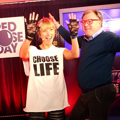 From one dancer to another - Ed Balls helps Sara Cox along on her Red Nose Day Danceathon