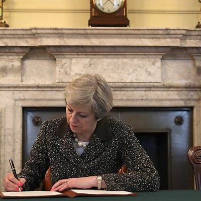 British Prime Minister Theresa May triggers Article 50 of the Lisbon Treaty today, formally beginning the UK's exit from the European Union. Manuela Saragosa speaks to British Brexit-supporting economist Ruth Lea and British member of the European parliament Richard Corbett about the challenges Britain now faces as it embarks on two years of negotiations with the EU. (Photo: Theresa May signs letter triggering Article 50, Credit: Getty Images)