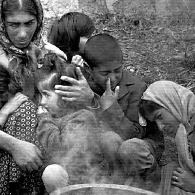 In April 1993, the Azerbaijani town of Kalbajar fell to ethnic Armenian separatists during the war over the disputed enclave of Nagorno-Karabakh. Photojournalist Khalid Asgarov tells Louise Hidalgo how he and his father were among a column of refugees who fled to safety on a two-day trek over the mountains. Picture: A refugee woman from Kalbajar comforts two of her children after escaping over the mountains in Azerbaijan, 10th April 1993. (Credit: Dima Korotayev/AFP/Getty Images)