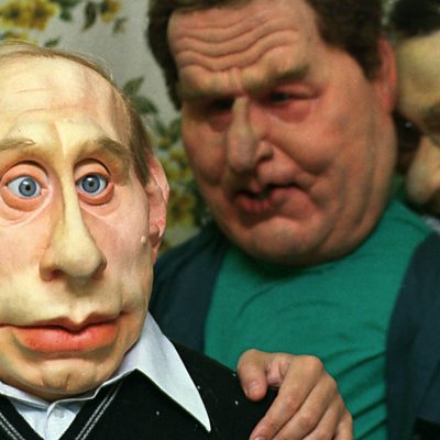 NTV, the only nationwide independent TV channel in Russia, was taken over in April 2001. It lost its independence despite a vigorous protest campaign mounted by its staff. Dina Newman speaks to the head of NTV at the time, Yevgeny Kiselev. Photo: Life size puppets of Russian political leaders including president Putin, on the set of NTV's popular satirical television show "Puppets"; June 29, 2000. Credit: Oleg Nikishin/Newsmakers/Getty
