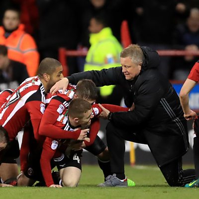 An emotional Sheffield United manager Chris Wilder reacts to their promotion.