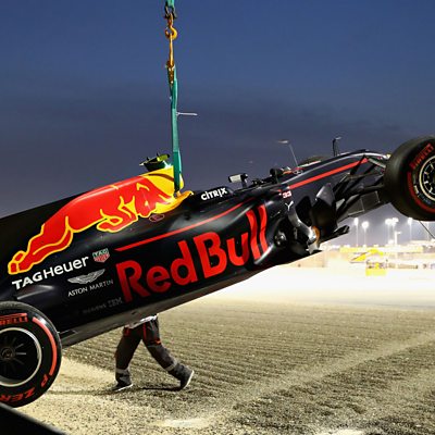 Red Bull's Max Verstappen crashes out of the Bahrain Grand Prix after his brakes failed. This clip is originally from 5 live Formula 1 on Sunday, 16 April 2017.