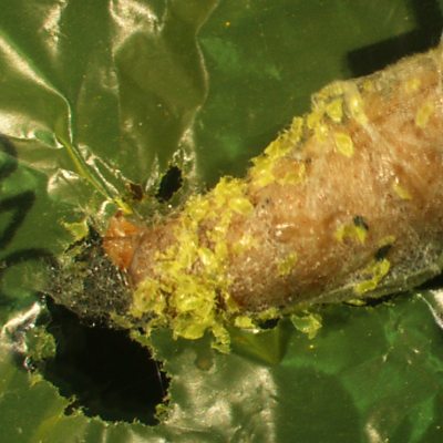 Polythene from plastic bags and bottles is polluting every corner of the Earth. So when a colleague of Professor Chris Howe, at University of Cambridge, discovered wax moth caterpillars can eat plastic, they wanted to find out whether it could be a useful tool to clear up waste plastic. Image: A wax worm chews a hole through plastic. Polyethylene debris can be seen attached to the caterpillar. Credit: Federi