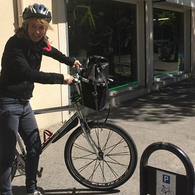 Before her personal Tour de France to chart the presidential election began, Emma Jane Kirby hired a bike from Paul Fournel in Paris. He spoke of how different the views were between residents of the capital and those elsewhere in the republic. (Photo: Emma Jane Kirby with her bike. Credit: BBC)