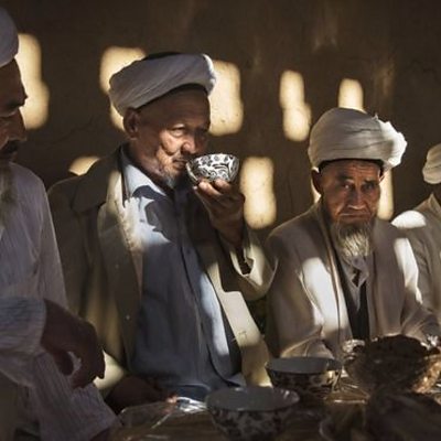 Uighur musicians playing in at an outdoor food court in Turpan in northwest China, as recorded by Jeff Gale (Picture: Library image of Uighur men Credit: AFP)