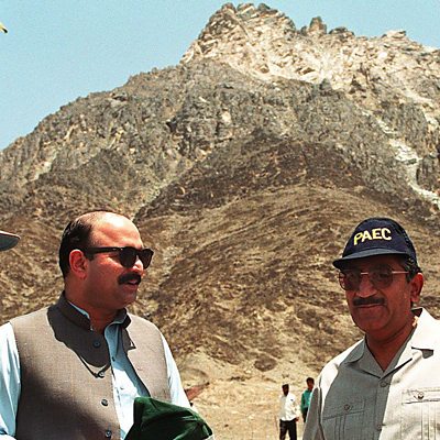 In May 1998 Pakistan courted international criticism after it responded to an Indian nuclear test, with an explosion of its own. In 2011 Rob Walker spoke to Dr Samar Mubarakmand who organised the test on the Pakistani side. Photo: Pakistan nuclear scientist Dr. Samar Mubarakmand (right) alongside Dr. Ishfaq Ahmed and Minister of Information Mushahid Hussain, in front of the hill under which Pakistan conducted its nuclear tests in May 1998 (SAEED KHAN/AFP/Getty Images)