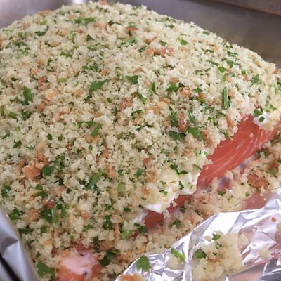 Ingredients • 6 x 150g/5oz salmon fillets, skinned • Salt and freshly ground black pepper • 150g/6oz cream cheese • Small clove garlic, crushed • ½ lemon, grated rind only • 25g/1oz fresh white breadcrumbs • 25g/1oz fresh, coarsely grated parmesan • 2 tbsp chopped fresh parsley, plus extra to garnish • Paprika Method 1. Preheat the oven to 200C/400F/Gas 6. 2. Season both sides of the salmon fillets and place on a greased baking sheet or roasting tin. 3. Mash the cream cheese with the garlic, salt and pepper and lemon rind. 4. Divide into six and spread on top of each salmon fillet. 5. Mix the breadcrumbs, parmesan and parsley in a mixer and season. 6. Sprinkle on top of the cream cheese mixture and dust with paprika. 7. Bake in the oven for about 15 minutes. To tell when the salmon is done, it will have changed from translucent to an opaque pink. 8. Serve immediately, garnished with chopped parsley. Refreshing Salad Ingredients • Salad • 25g pine nuts • 1 red chicory • 1 green chicory • 2 clementines • 100 g baby spinach • 4 sprigs of fresh mint • 45 g Manchego cheese • 2 tablespoons sherry vinegar • 2 tablespoons extra virgin olive oil • 1 teaspoon runny honey Cooking: • Toast the pine nuts in the frying pan for a few minutes, tossing often. • Finely slice the stalk ends of the chicory and click apart the upper leaves into a serving bowl • Peel and finely slice the clementines, add to the bowl with the baby spinach, then pick over the mint leaves • Shave over a tiny bit of Manchego and scatter with the hot nuts. In a cup, make your dressing with the vinegar, extra virgin olive oil and honey, then season to taste.
