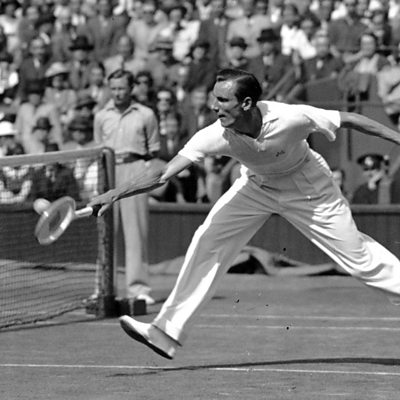 In the 1930s, Fred Perry won three Wimbledon tennis championships in a row, becoming a global celebrity. Simon Watts tells his story using BBC archive interviews with Perry and other players from a golden era of tennis. PHOTO: Fred Perry in action at Wimbledon in the 1930s (Getty Images)