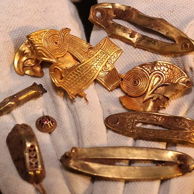 In 2009, a metal detectorist found the largest ever hoard of Anglo-Saxon gold and silver in a field in England. More than 3,000 pieces were recovered. Many appeared to be decorations taken from swords, as well as Christian artefacts. The hoard is believed to date back to the 7th Century when Anglo-Saxon kingdoms battled each other for supremacy in England. Alex Last has been speaking to Terry Herbert who found the treasure and archaeologist Dr Kevin Leahy who examined the hoard. Photo: Just some of the treasures from The Staffordshire Hoard (Photo by Christopher Furlong/Getty Images)