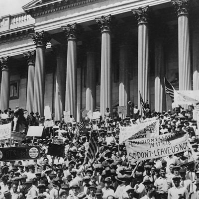 In the summer of 1932, tens of thousands of American First World War veterans marched on Washington DC to demand the bonus they'd been promised by the government for their part in the war. It was the height of the Great Depression and many were unemployed and hungry. They called themselves the Bonus Army. Louise Hidalgo talks to author Paul Dickson about their story. Photograph: Bonus Army marchers stage a mass vigil on the steps of the Capitol building in Washington while the Senate debates their case (Copyright: Getty Archive)