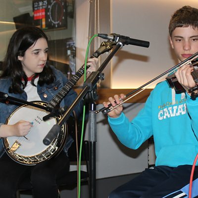 Four young musicians from the Ulster Fleadh perform The Boop Set for Gerry Kelly.