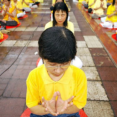 In July 1999, the spiritual movement Falun Gong was banned in China. Thousands of people were arrested. The Chinese government says Falun Gong is an "evil cult", but followers of the movement say they have been the victims of state persecution. Witness speaks to Falun Gong practitioner Chao Yu and journalist Ian Johnson. (Photo: Falun Gong practitioners stage a sit-in protest outside the Convention and Exhibition Centre in Hong Kong, 2002. Credit: Peter Parks/AFP/Getty Images)