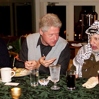 In 2000 the US led a major effort to end the Israeli-Palestinian conflict. President Bill Clinton brought the two sides together at the leafy presidential retreat in Maryland. The Israeli leader, Ehud Barak and the Palestinian leader, Yasser Arafat, failed to reach any agreement and the summit ended in failure. Farhana Haider has been speaking to the senior American diplomatic interpreter and policy adviser, Gamal Helal who attended the Camp David summit. White House photo released 16 July 2000 US President Bill Clinton (C) Israeli Prime Minister Ehud Barak (L) and Palestinian Chairman Yassar Arafat and Gamal Helal at a working dinner at Camp David, Maryland during the Middle East Peace Summit. Credit: SHARON FARMER/AFP/Getty Images