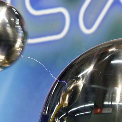 Rhys Phillips, engineer at Airbus Group Innovations, shows presenter Marnie Chesterton how to make tiny bolts of lightning with a Van de Graaff generator. (Image: Lightning being produced with a 'Van de Graaff generator'. Credit: Getty Images)