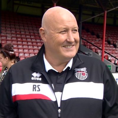 Grimsby Town manager Russell Slade speaks to John Tondeur after his side's defeat