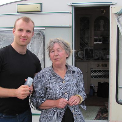 Labhraíonn Jack Delaney faoin todhchaí atá i ndán dó féin agus don lucht siúil i gcoitinne agus ceolann sé giota beag de “I’m A Free Born Man Of The Travelling People” le Ewan McColl. Sa phictiúr seo tá Jack in éineacht le Chrissie Donohue-Ward ag an carbhán s’aici i dTuaisceart Bhaile Átha Cliath. Jack Delaney talks about his future and the future of the travelling community in general, and we hear him singing Ewan McColl’s “I’m A Free Born Man Of The Travelling People.” Pictured: Jack with Chrissie Donohue-Ward at her caravan in North Dublin.