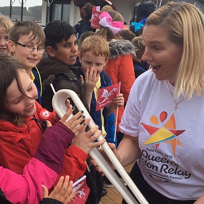 Sara Esyllt sy'n holi Elin Haf Davies oedd yn cario Baton Gemau'r Gymanwlad yn Y Barri
