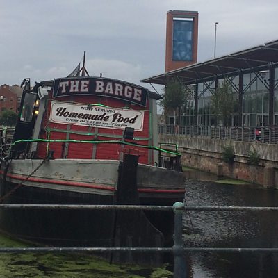 Lara King talks to staff and customers on the floating pub.
