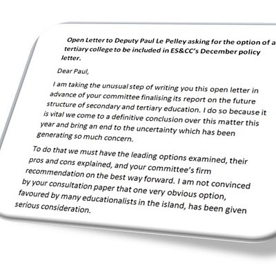 Deputy Peter Roffey writes an open letter to the Education Committee President, asking him to consider the option of a tertiary college in its December policy letter.