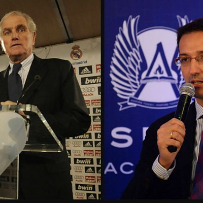 Ex Real Madrid president Ramón Calderón admires Leeds United director Ivan Bravo.