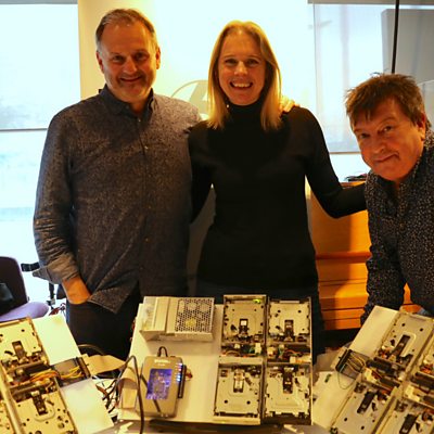 Professor Danielle George shows Mark & Stuart how she makes music with floppy disk drives