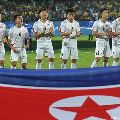 North Korea is one of the most politically isolated countries on earth, with controlled access to news outside the country. Yet if you turn on State TV you can watch the latest Champions League games, in its version of 'Match Of The Day.' Sport has historically been important for communist regimes, like North Korea, and football is king - as BBC Monitoring's Alistair Coleman explains. (Photo: Football players of North Korea applaud after their national anthem prior to the group stage football match between North Korea and Niger in the FIFA U-17 World Cup in Kochi on October 7, 2017, Credit: MANJUNATH KIRAN/AFP/Getty Images)