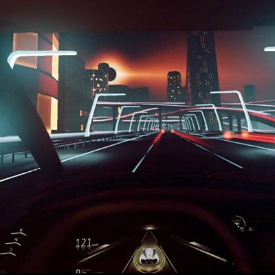 Autonomous cars of the future could give us more time to relax and entertain ourselves. Car maker Renault has imagined a future where virtual reality will take our minds off the journey by transporting us to alternative dimensions. With the aid of a backup driver and in controlled conditions, the BBC’s Theo Leggett went to northern France to give their Symbioz concept car a spin. (Photo: Driving along a virtual motorway through a futuristic cityscape during a solar eclipse. Credit: Ubisoft/Renault)