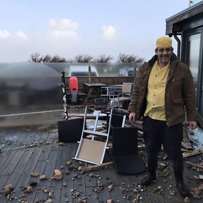 Vistas owner Nick Percy arrived to a scene of destruction this morning - with tables, windows and chairs smashed after debris was thrown over the coastal wall on the west coast.