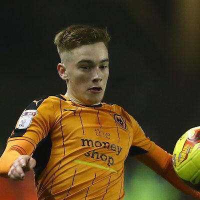Connor Ronan speaks to Andy Moon after joining Portsmouth on loan from Wolves