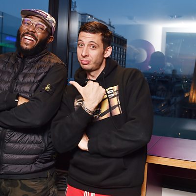 Example passes through the studio and plays a game of 'What's the sample, Example?'