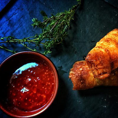 Ingredients: 200g haggis, crumbled Half red onion, finely chopped 50g spicy Mexicana cheese Processed cheese slices Spring roll pastry or filo pastry Egg white Veg oil Combine the haggis, onion, Mexican cheese. Roll into small sausage shape. Wrap a piece of processed cheese around then roll up in a half sheet of pastry. Fry in oil heated to 170C until golden then drain in kitchen roll and serve hot with chilli dipping sauce.