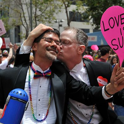Scott Keeter from the Pew Research Center explains how a series of surveys on same sex marriage in the USA over two decades mirrored a shift in public opinion. Image: Stuart Gaffney (L) and John Lewis, plaintiffs in the 2008 Defense of Marriage Act (DOMA) case Credit: Josh Edelson, AFP, Getty Images.