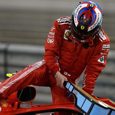 Ferrari's Kimi Raikkonen is forced to retire from the race after an issue during his pit stop. This clip is originally from 5 live Formula 1 on Sunday, 8 April 2018.