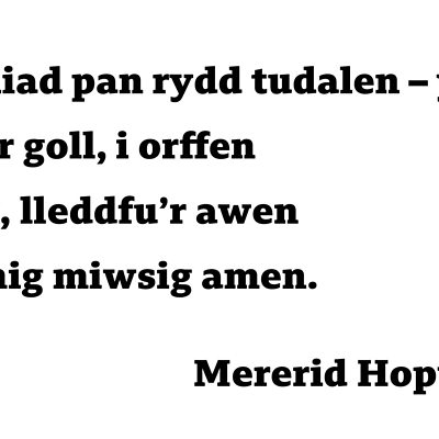 Daw eiliad pan rydd tudalen – y gair fu ar goll, i orffen yr alaw, lleddfu’r awen a chynnig miwsig amen. Mererid Hopwood