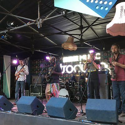 Congolese jazz ensemble Kongo Dia Ntotila perform Mutwashi from their new album 360° on the BBC Introducing stage at Latitude. The self-described 'Afro-JOY' outfit is led by Kinshasa-born bassist Mulele Matondo, a teacher of Congolese and African musics. Introducing this track Mulele said, "Some people claim blues come from Mali but the regional people say the blues come from Congo.” The Introducing stage at Latitude was a handpicked lineup of the most exciting emerging artists who have uploaded their music to the BBC Introducing website. Late Junction continued our long affinity with the Lavish Lounge stage in the enchanted woods of the festival to bring you some of our favourite performances.