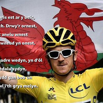 Ar ras hir i Baris est ar y beic, Gymro balch. Drwy'r ornest, Credu ac anelu wnest Yn iawn, a'i wneud yn onest. Wedi'r reid, tyrd adre wedyn, yn d'ôl O'th bedalu sydyn, A gwn y bydd gan bob un Groeso a mawl i'th grys melyn.