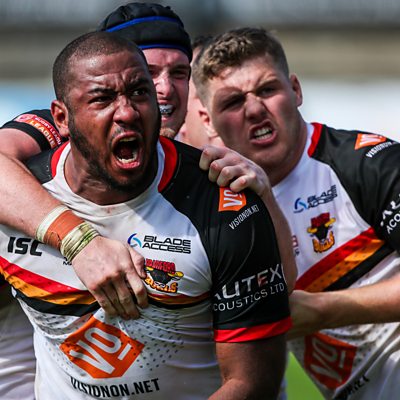Action and reaction as Bradford Bulls secure promotion back to the Championship with victory over Workington Town in League One play-off final. {Commentary: Tom Alderson & Karl Harrison} {Image: SWPix.com}